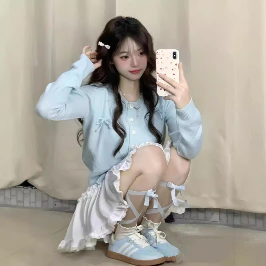 芭蕾风针织开衫春季女装新款蝴蝶结甜妹韩系软糯上衣蓝色毛衣外套