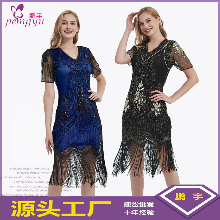 Gaun malam pesta rumbai lintas batas Eropa dan Amerika 1920 antik berpayet manik-manik ukuran besar Amazon populer wanita