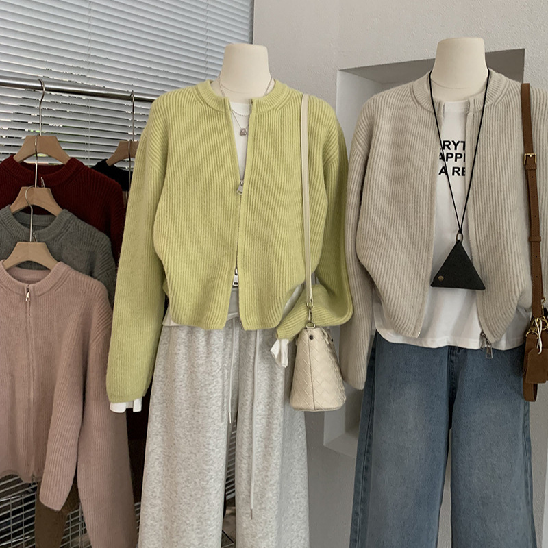 欧玛莱 韩版坑条圆领拉链针织开衫秋季外搭宽松显瘦毛衣外套 4785