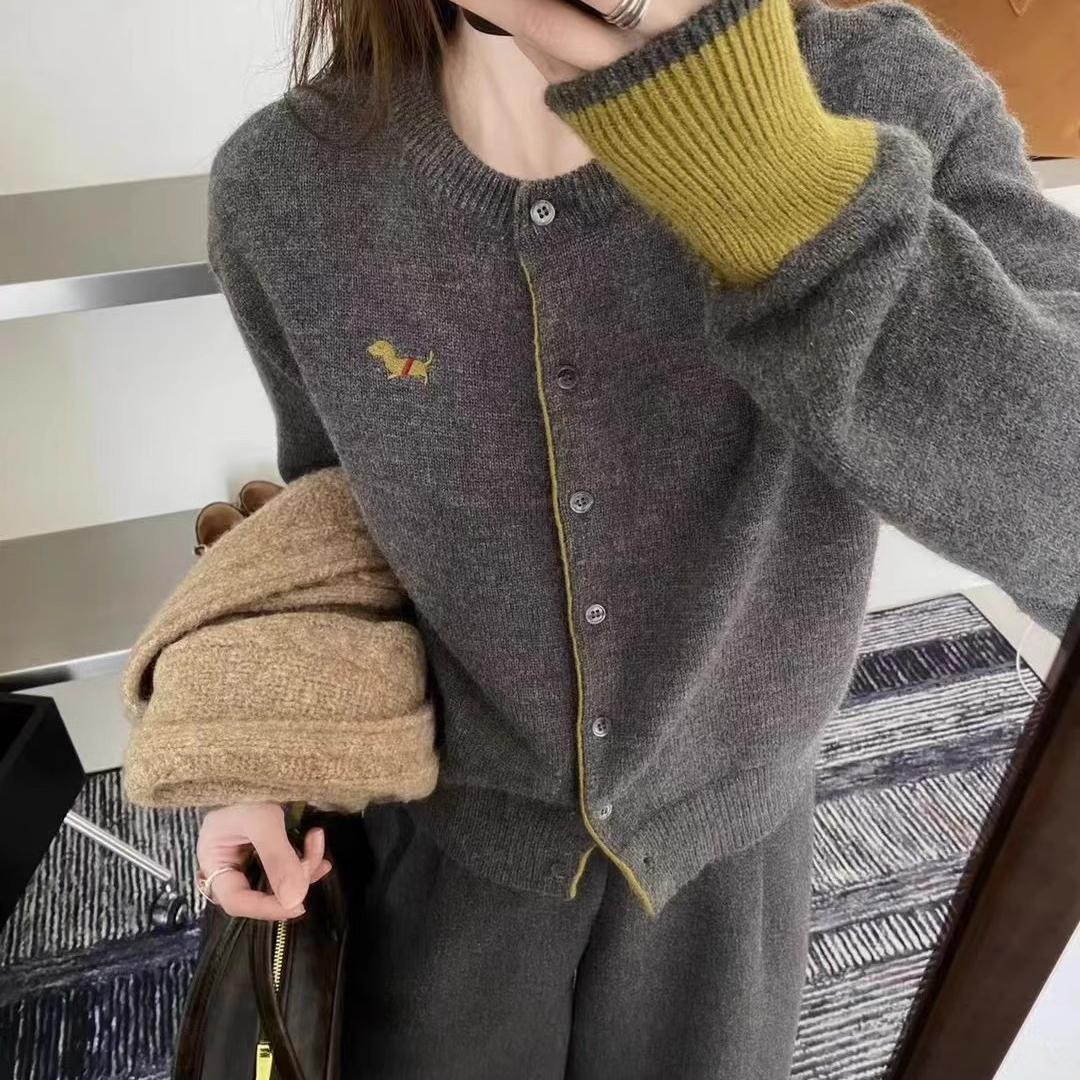 秋冬小狗刺绣针织开衫女撞色袖口拼接设计感春秋毛衣内搭短上衣