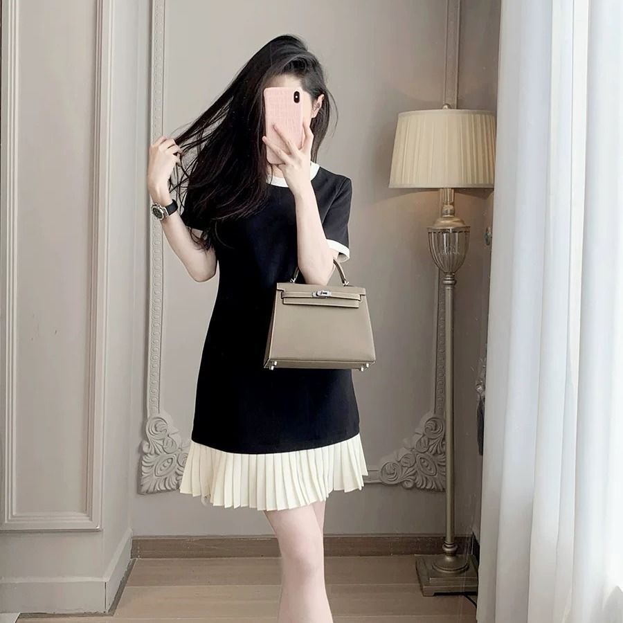 Gaun Warna Hitam Gaya Chanel Berkualitas Tinggi Ukuran Besar Gadis Gemuk Rok Lipit Kombinasi Model Pendek Ramping Elegan Musim Panas Wanita