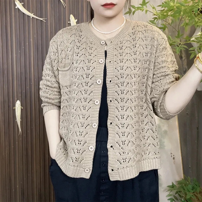 春秋季新款针织开衫女圆领单排扣设计感镂空长袖宽松百搭外套女潮