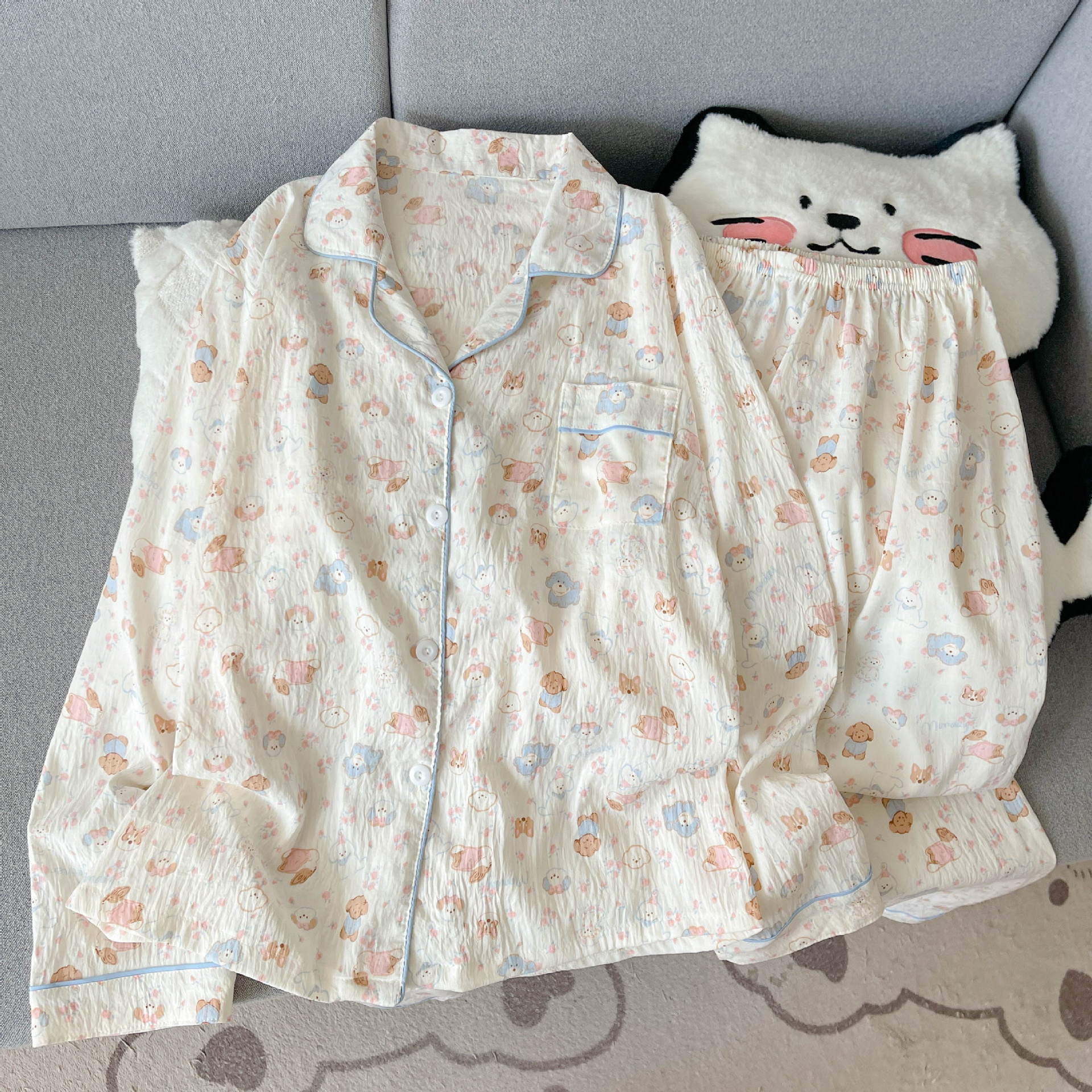 Baju Tidur Lintas Batas Setelan Wanita Model Musim Semi dan Musim Gugur Lengan Panjang Kardigan Pakaian Rumah Kain Kasa Katun Selebgram Ukuran Besar Lucu Dipakai Luar