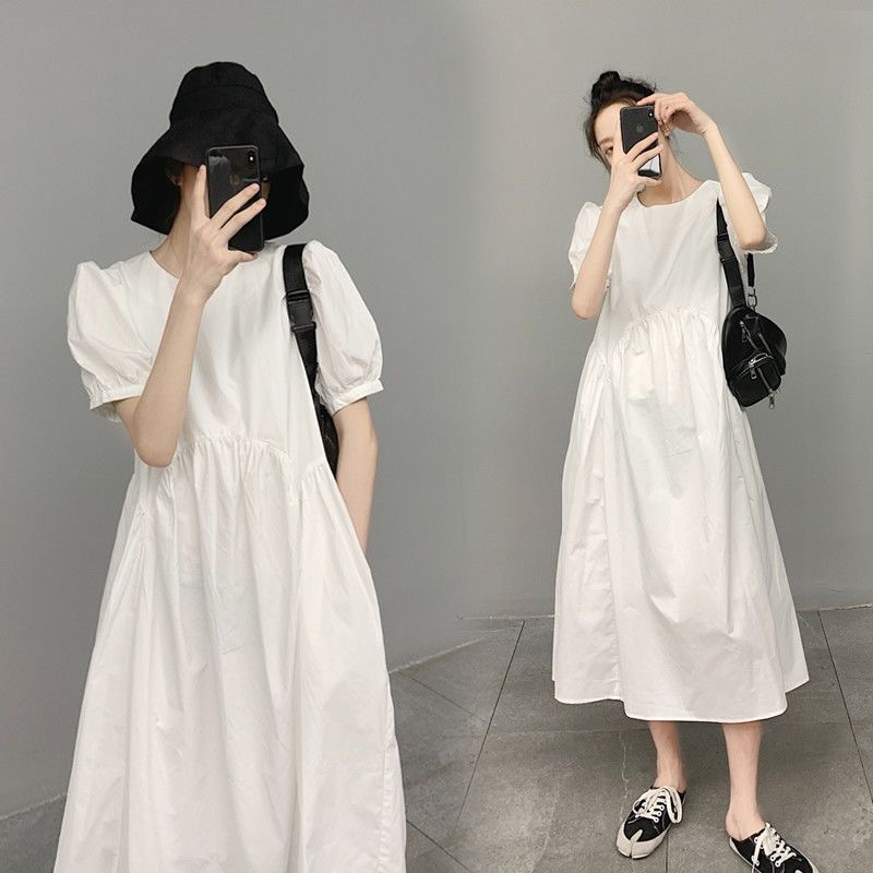 Gaun sederhana wanita musim panas 2023 baru lengan puff fat sister sedikit lemak menutupi pelangsing ukuran plus Semua cocok rok fashion