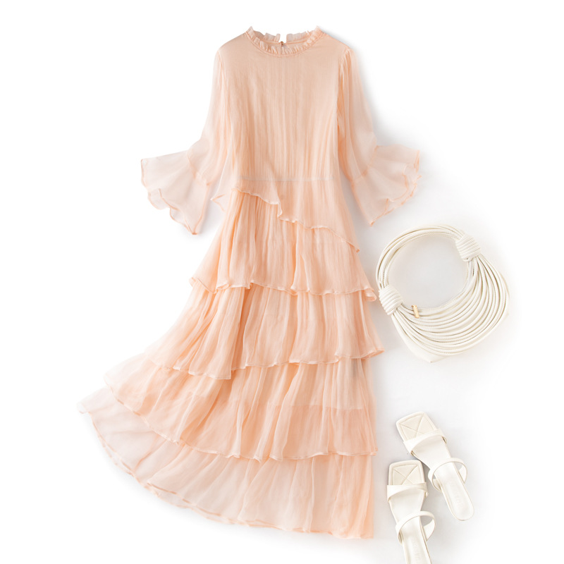 Gaun Sutra Wanita Ukuran Besar Kerah Bulat Warna Solid Model Baru Rok Sutra Murbei Sederhana Elegan OL 85066