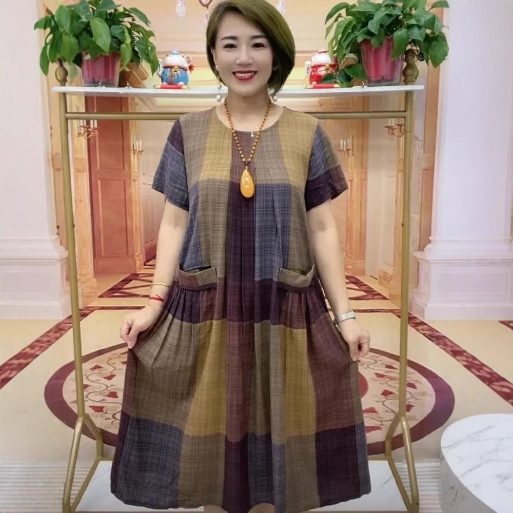 Gaun Santai Versi Besar Kantong Ganda Kota-Kotak Hugh Musim Panas Pakaian Wanita Modis Elegan Ukuran Besar Rok Orang Tua Tambah Tambah Besar