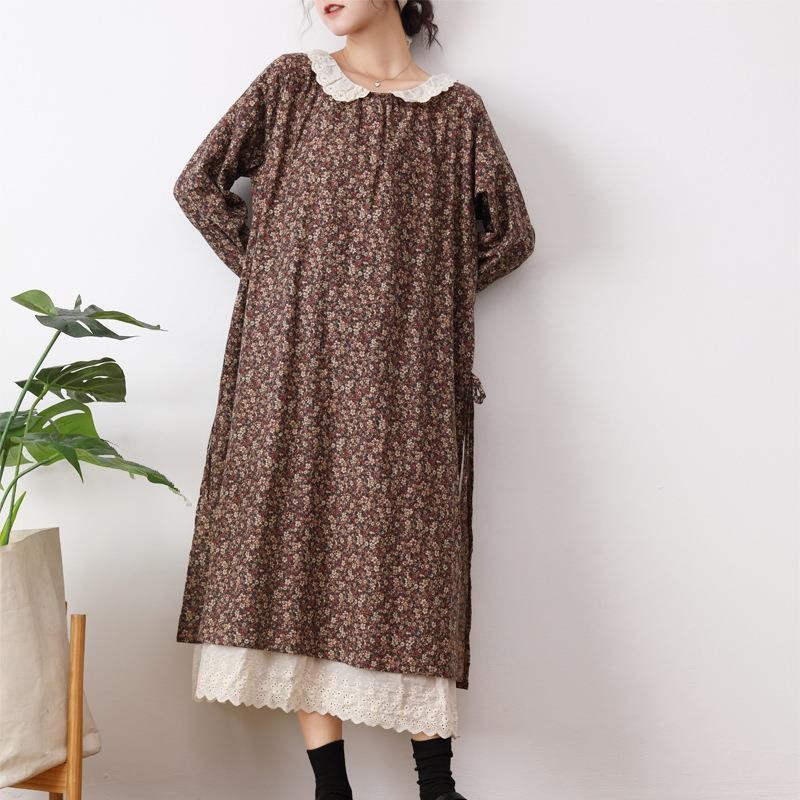 Gaun lengan panjang dua potong wanita, gaun katun linen motif bunga manis Jepang musim gugur kerah boneka bordir longgar palsu