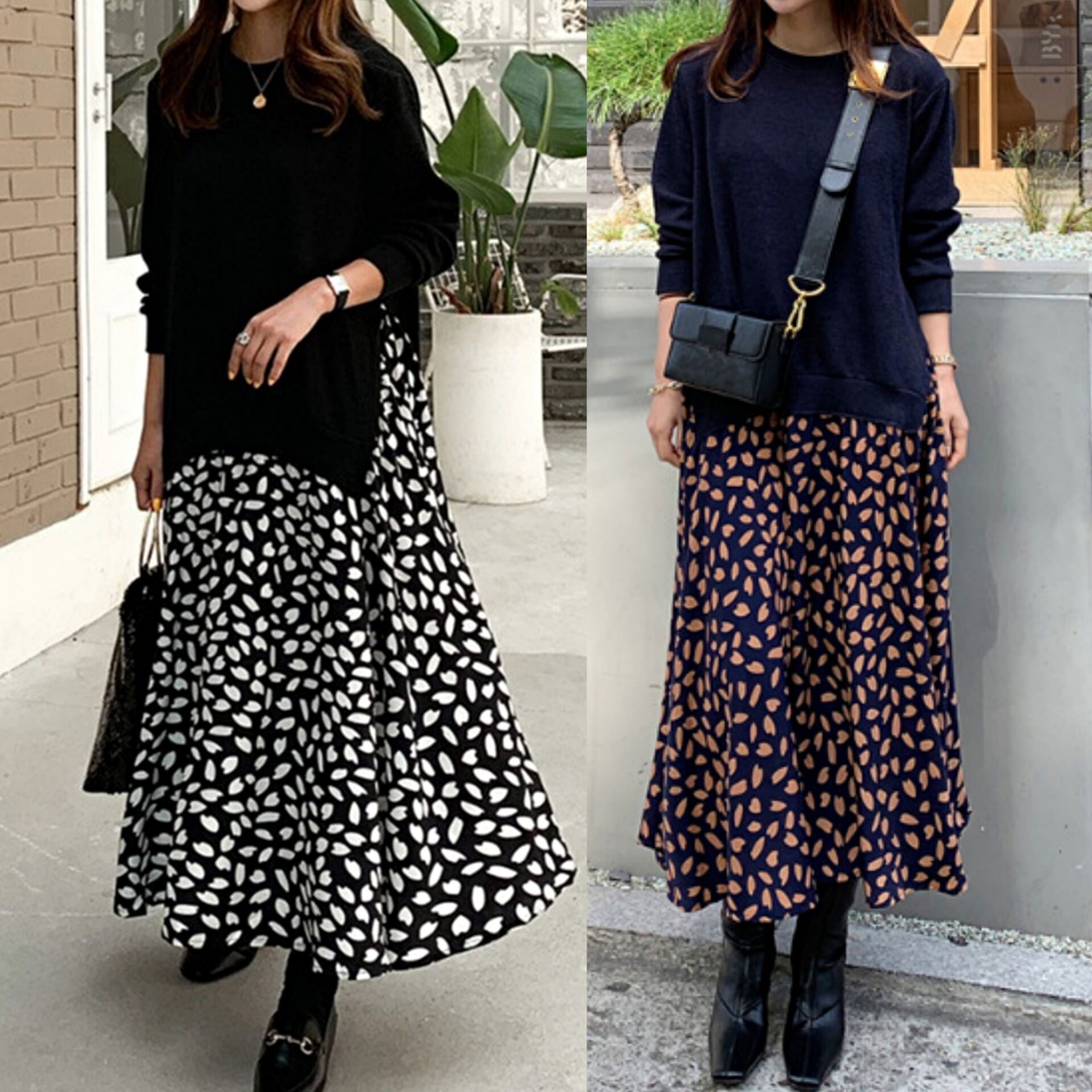 Gaun dua potong palsu leher bulat gaun ayun besar motif jahitan kaus lengan panjang ukuran besar musim semi dan gugur 2023