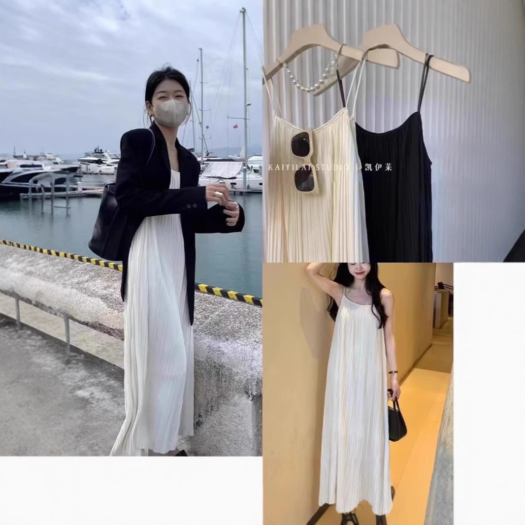 Rok Panjang Warna Polos Gaun Tali Longgar Lipit Gaya Prancis Gaya Manis Musim Panas Wanita Ukuran Besar Gaya Santai