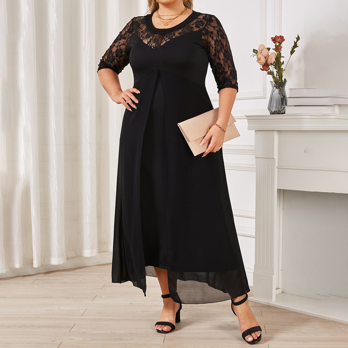 AliExpress gaun elegan lengan setengah panjang, gaun elegan kerah bulat jahitan renda leher V lengan setengah ayun ukuran plus untuk wanita