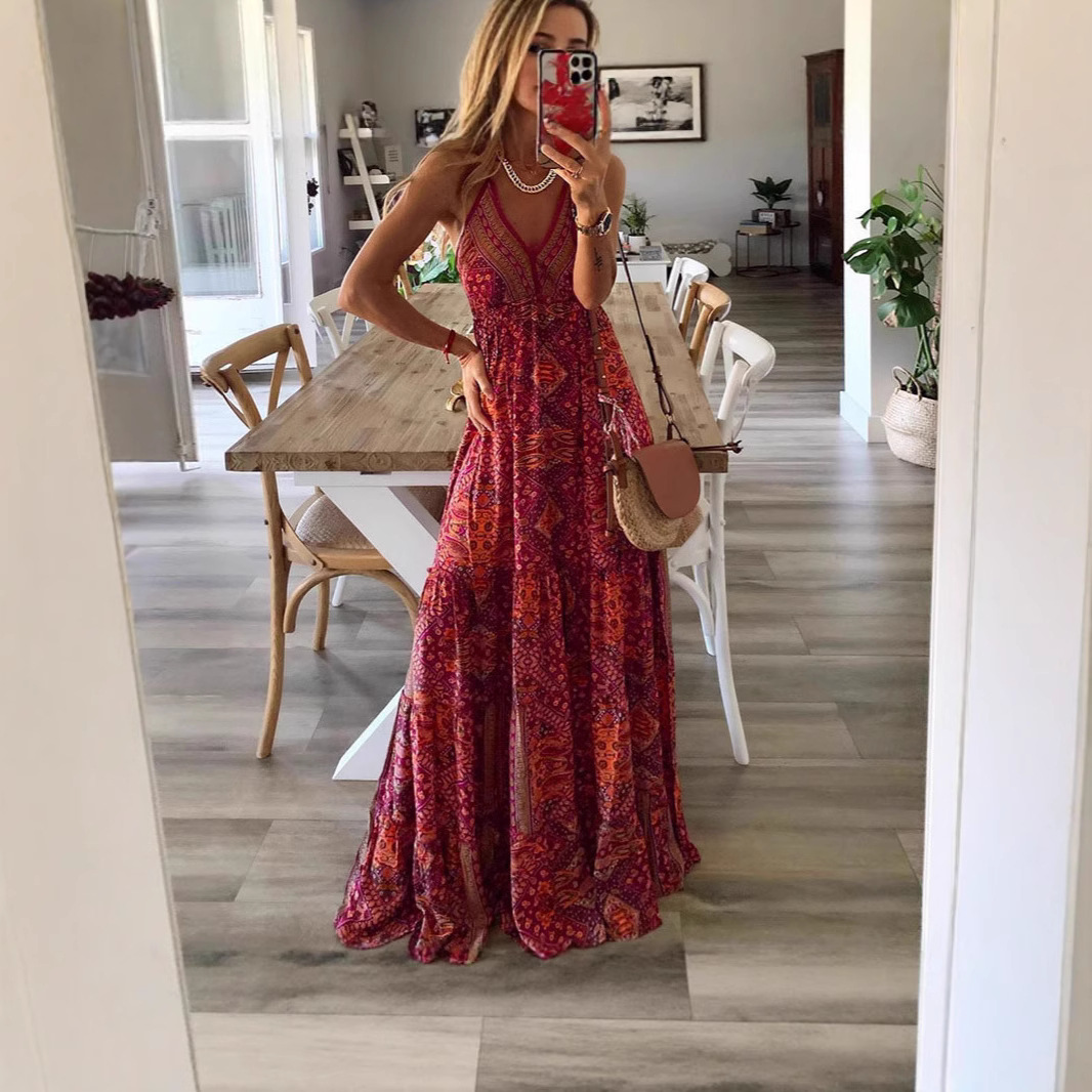 Rok Panjang Model Baru Gaya Bohemian Model Baru Model Eropa Amerika 2025 Rok Terusan Bunga Motif Cetak Kerah V Pinggang Tinggi Pakaian Wanita