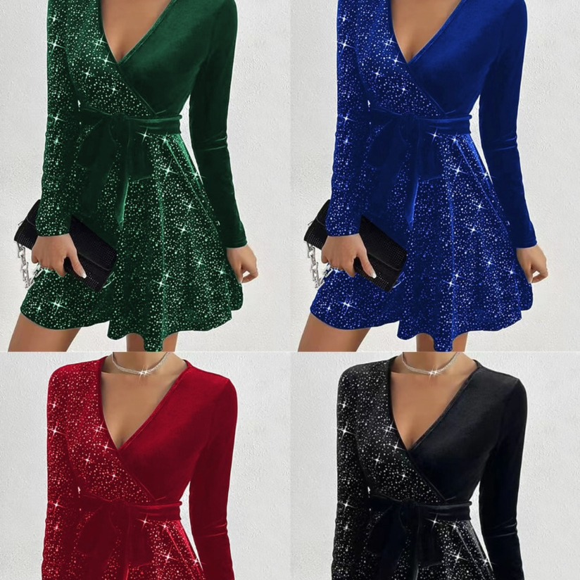 Gaun pesta musim gugur dan dingin 2025 lintas batas Amazon Eropa dan Amerika, seksi dengan kerah V, potongan pinggul, rok pendek asimetris, dan payet.