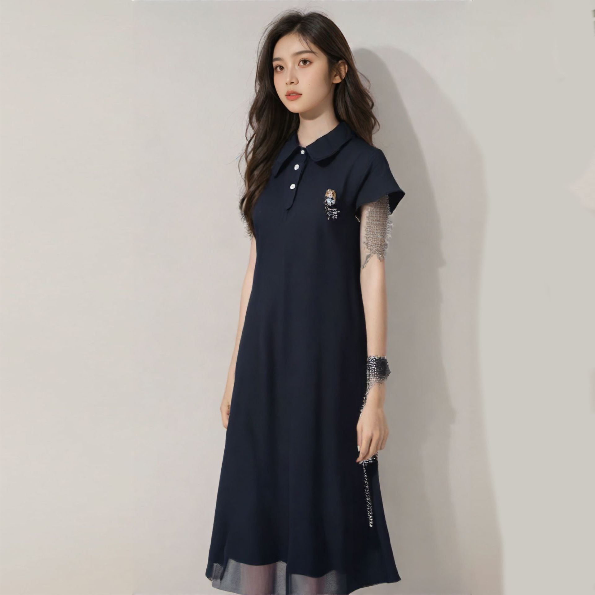 Pakaian Wanita Ukuran Besar Gaun Lengan Pendek Gaya Sekolah Kerah Angkatan Laut Gaya Korea Musim Panas Rok Elegan Terlihat Langsing Wanita Gemuk