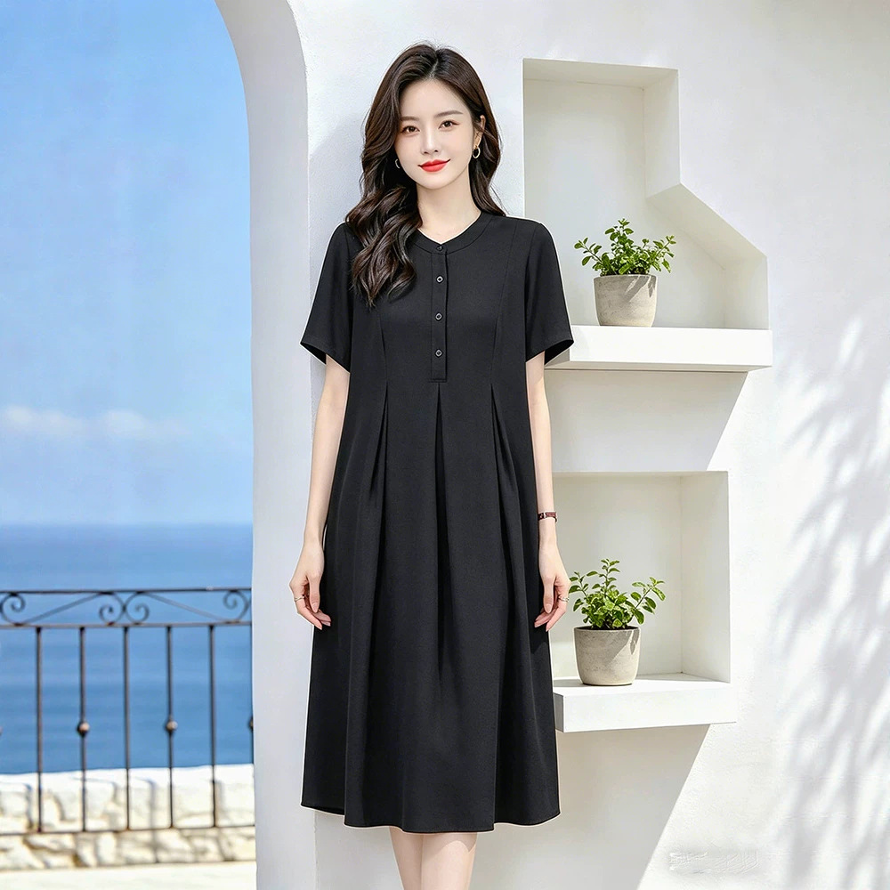 Rok kue lengan pendek temperamen Retro, 2024 musim panas baru ukuran plus wanita longgar gaun ramping 5392 663