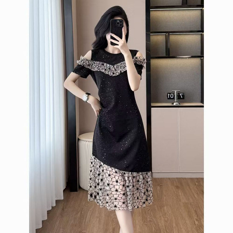 AliExpress wish Gaun Wanita Lengan setengah panjang, gaun formal atasan renda palsu dua potong ukuran besar, jahitan renda palsu 9743