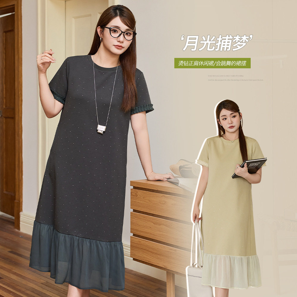 Gaun Kasual Berlian Panas Jahitan Lipat Kerah Bulat Elegan Gaya Korea Rok Terlihat Kurus Longgar Ukuran Besar Wanita Gemuk 65334
