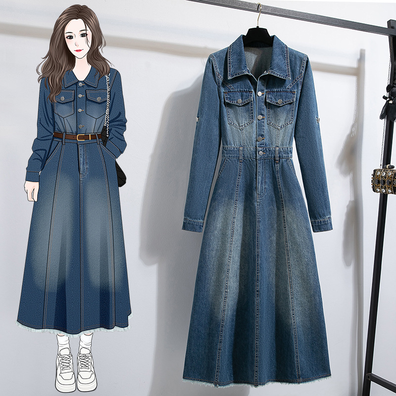 Gaun Denim Lengan Panjang Berkualitas Baik Foto Padat Rok Panjang Rok Denim Elegan Longgar Wanita Ukuran Besar Ukuran Besar Musim Semi