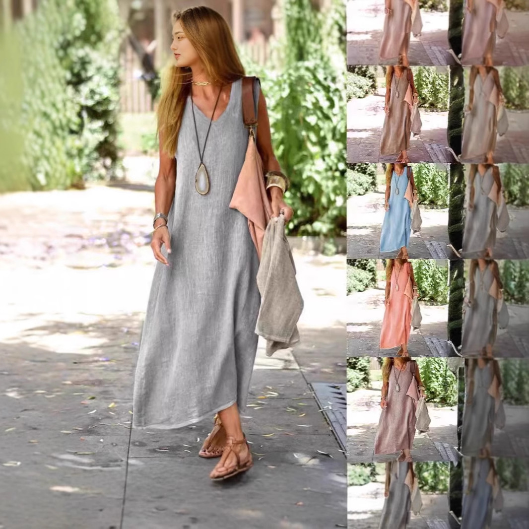 Gaun Komuter Mudah Dipadu Padan Terlihat Langsing Longgar Kerah V Linen Model Baru Musim Semi dan Musim Panas 2025 Foto Solid Jubah Ukuran Besar Kasual Wanita