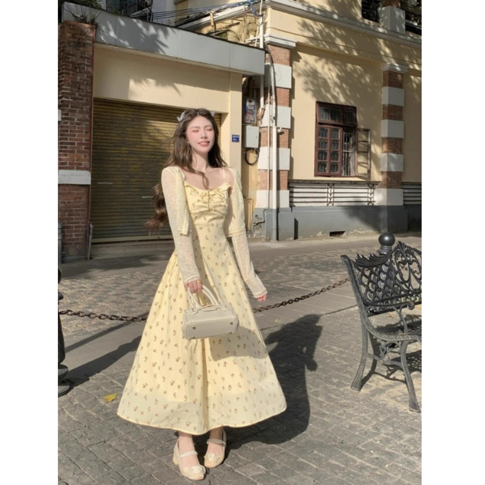Gaun Bunga Kecil Pakaian Wanita Ukuran Besar Model Baru Musim Panas Rok Panjang Menutupi Perut Terlihat Langsing Membentuk Pinggang Modis Musim Semi 2025