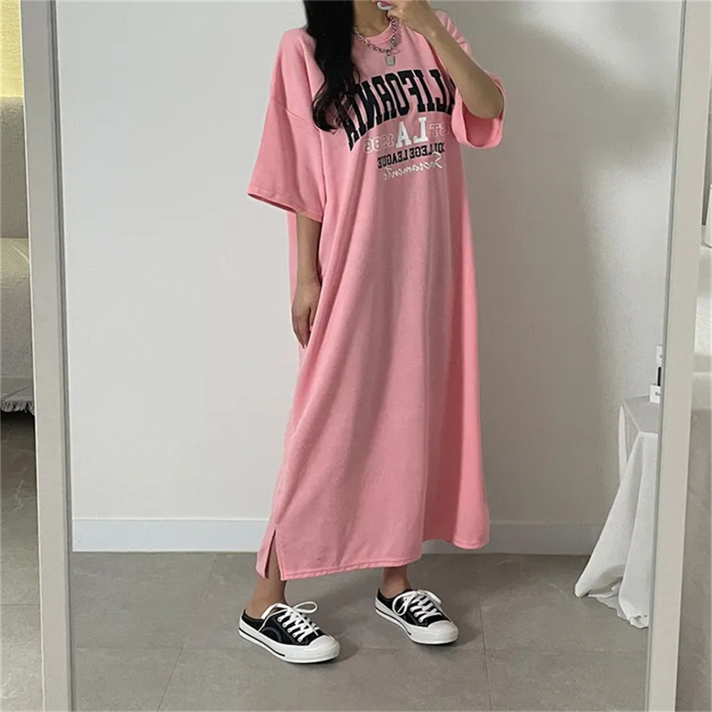 Gaun Korea Warna Merah Muda Pakaian Wanita Kartun Ukuran Besar Kaus Kasual Wanita Gemuk Di Bawah Lutut Gaun Tidur Wanita Musim Panas
