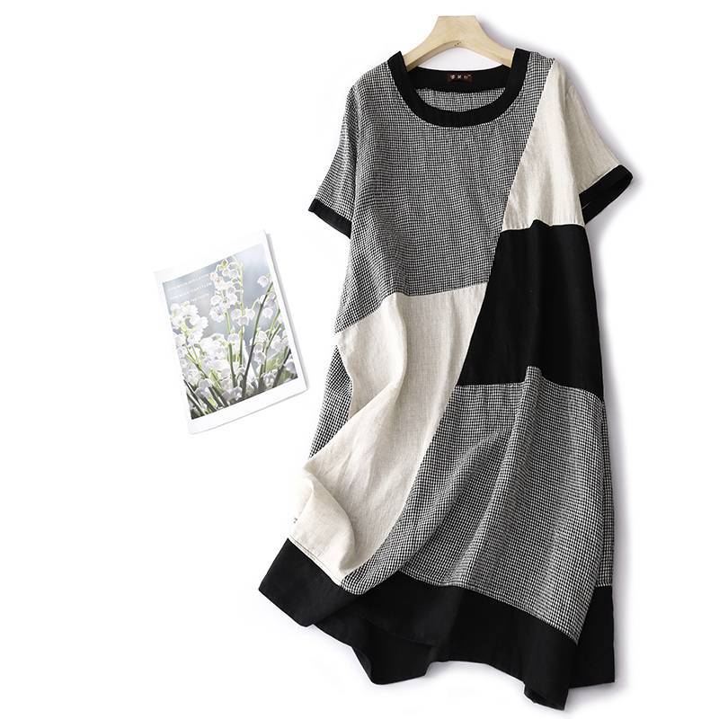 Gaun tipis sambungan warna rami desain musim panas rok ukuran plus retro longgar wanita