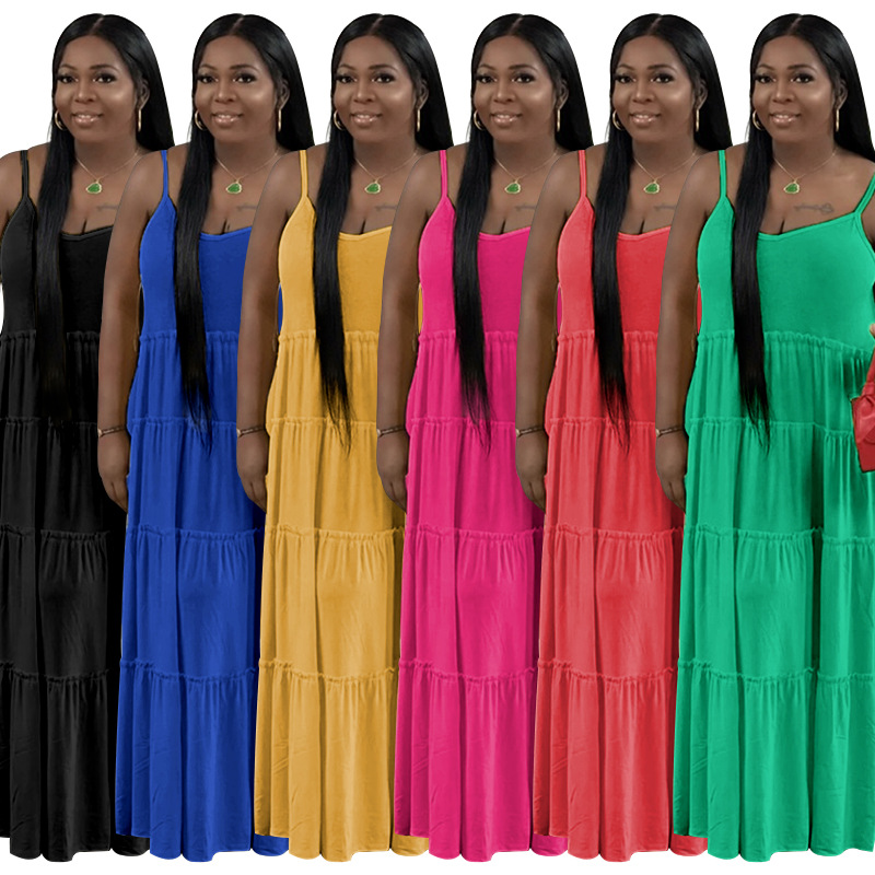 Gaun kasual mode wanita ukuran plus Eropa dan Amerika baru musim panas 211169 warna polos selempang seksi lipit