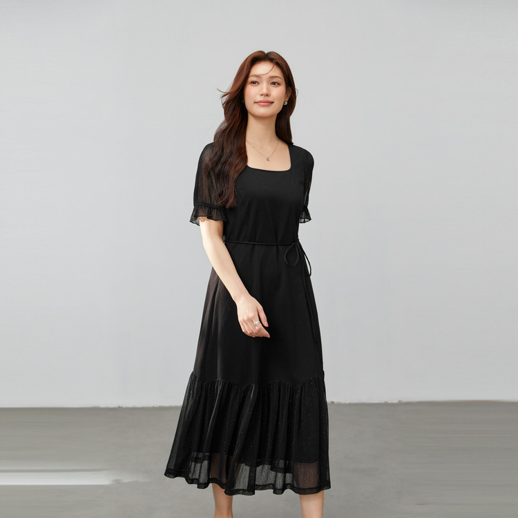 [Gaun Kerah Persegi Elegan Terlihat Langsing Pinggang Sambungan Bergaya Trendi] Pakaian Wanita Ukuran Besar Pakaian Musim Panas Wanita Gemuk Model Baru