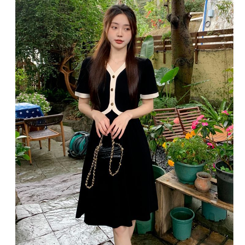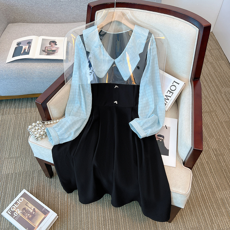 Pakaian Wanita Ukuran Besar Gaun Sosialita Gaya Chandis Model Baru Musim Panas 2025 Rok Hitam Kecil Terlihat Langsing Pinggang Terlihat Dua Potong Palsu