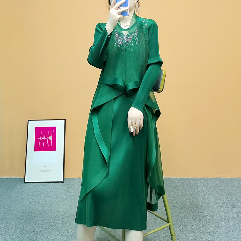 Gaun Lingying Pleated L193 [Ready Stock] Musim Semi dan Gugur 2025, Berhias Berlian Imitasi, Ukuran Besar, Model Dua Potong, Busana Ibu dengan Keliman Rok Mengembang.
