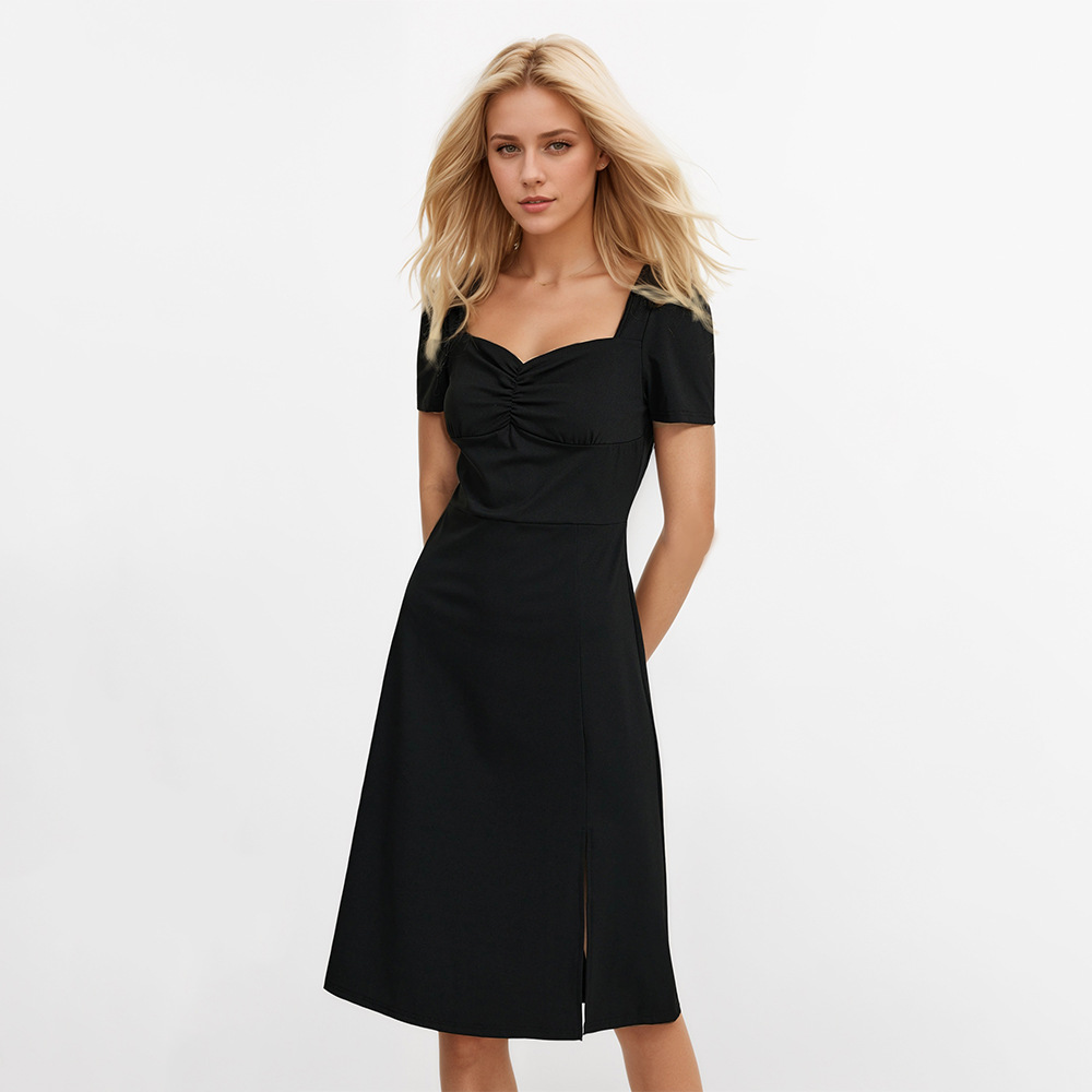 2024 gaun pinggang berlipat belahan seksi retro kerah persegi gaun pelangsing ramping lengan pendek musim panas JR60001