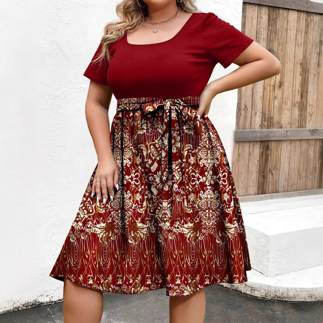 Gaun Motif Bunga Korset Lengan Pendek Kerah Bulat Elegan Trendi Fashion Amazon Temu Eropa dan Amerika Ukuran Besar