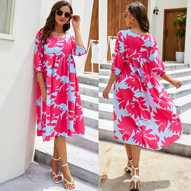 Pakaian Wanita Eropa dan Amerika 2025 Amazon AliExpress Musim Panas Meledak Longgar Kasual V-neck Bunga Liburan