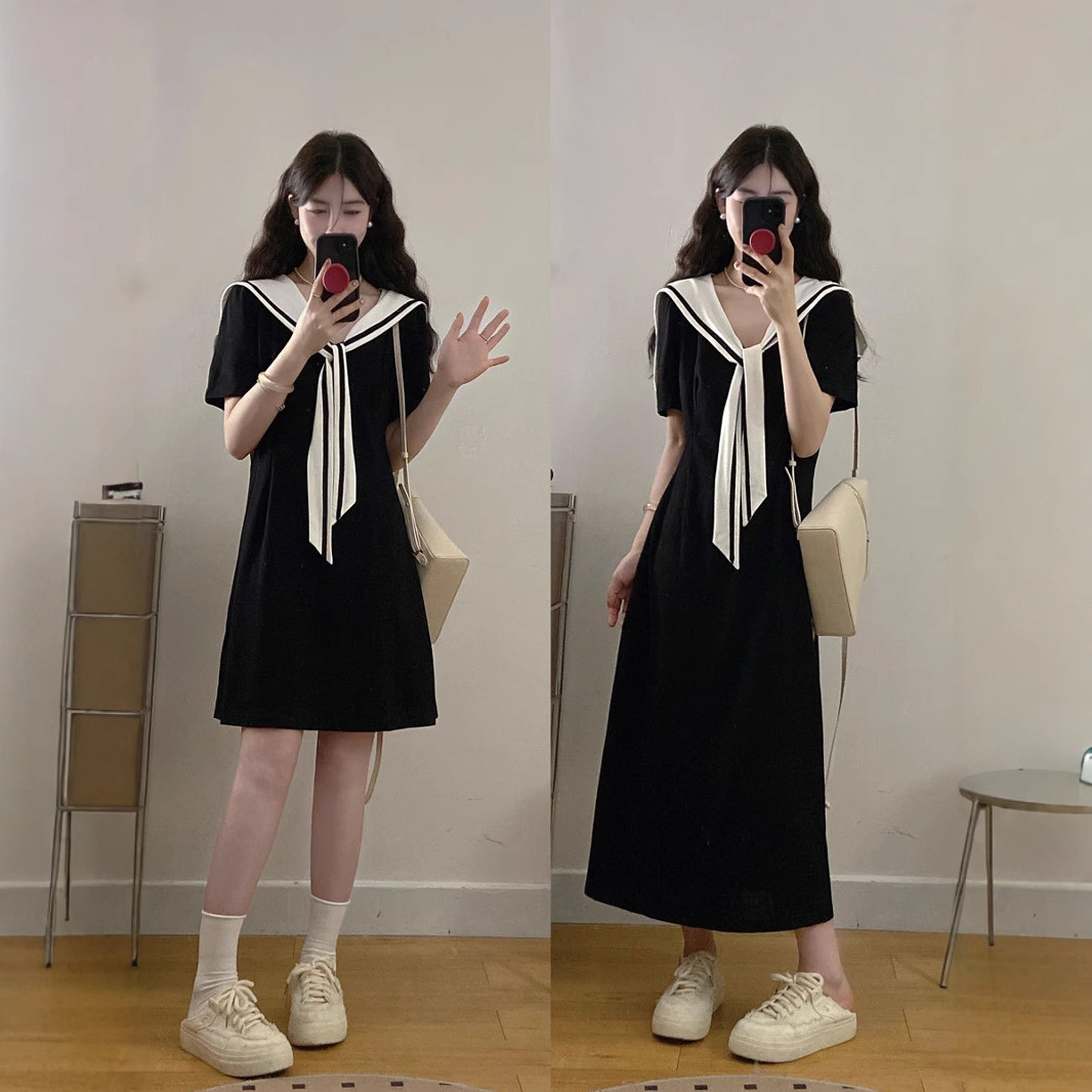 Pakaian Wanita Ukuran Besar Gaun Lengan Pendek Gaya Sekolah Kerah Angkatan Laut Gaya Korea Musim Panas Rok Elegan Terlihat Langsing Wanita Gemuk
