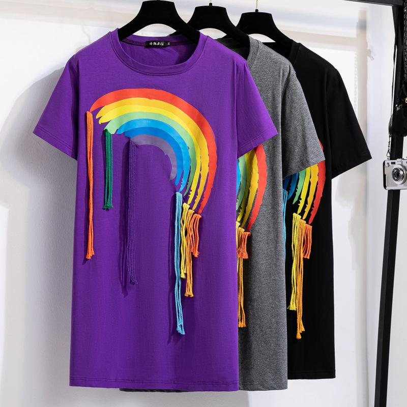 Dress pelangi wanita, Kaus panjang sedang ukuran besar 2024 keren modis 170