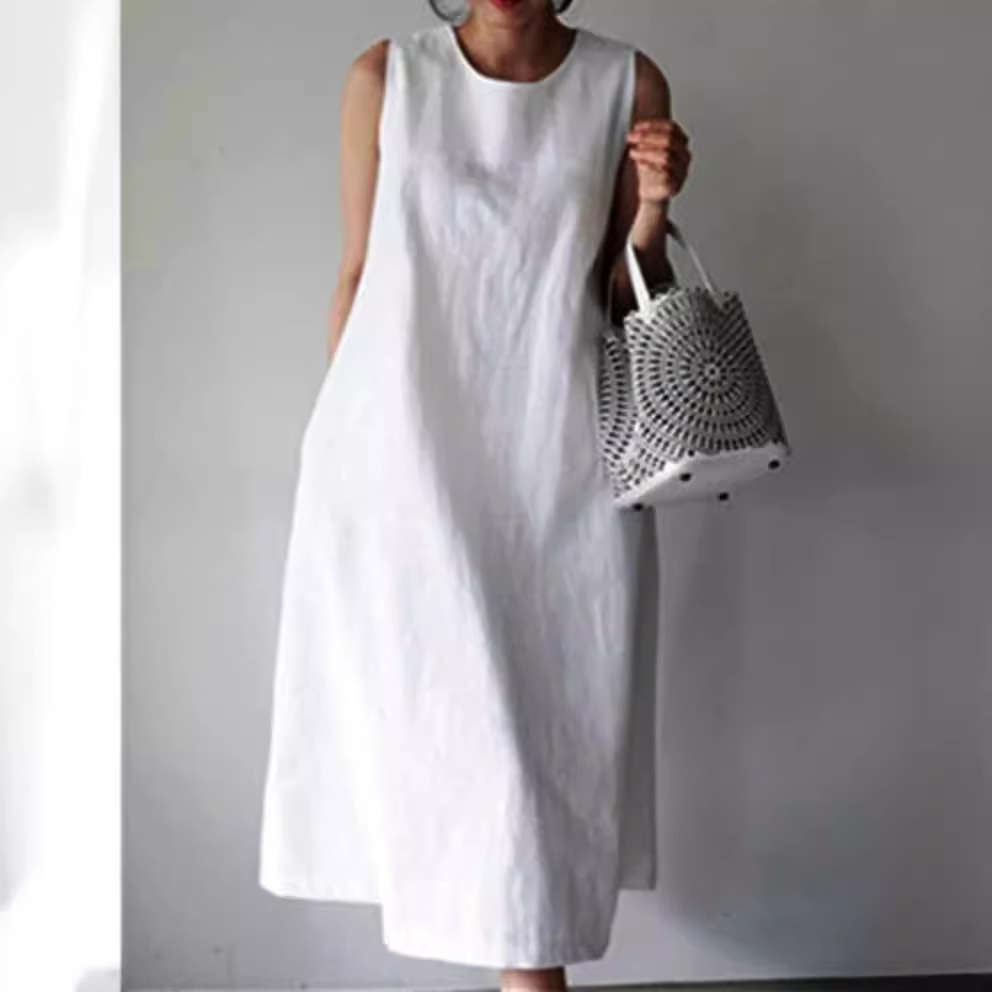 Gaun rompi katun linen tanpa lengan, gaun panjang setengah leher bulat gaya Korea longgar ukuran besar musim panas 2021
