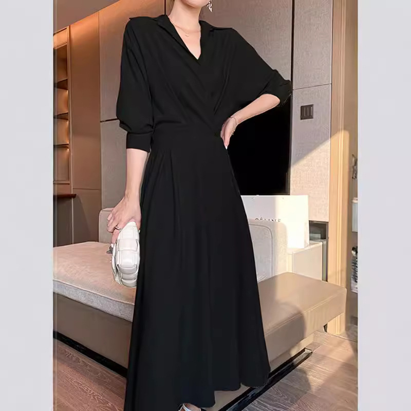 Gaun lengan panjang wanita, gaun baju wanita ukuran besar musim semi dan musim gugur, baju gadis gemuk pinggang ketat menutupi perut, kerah temperamen