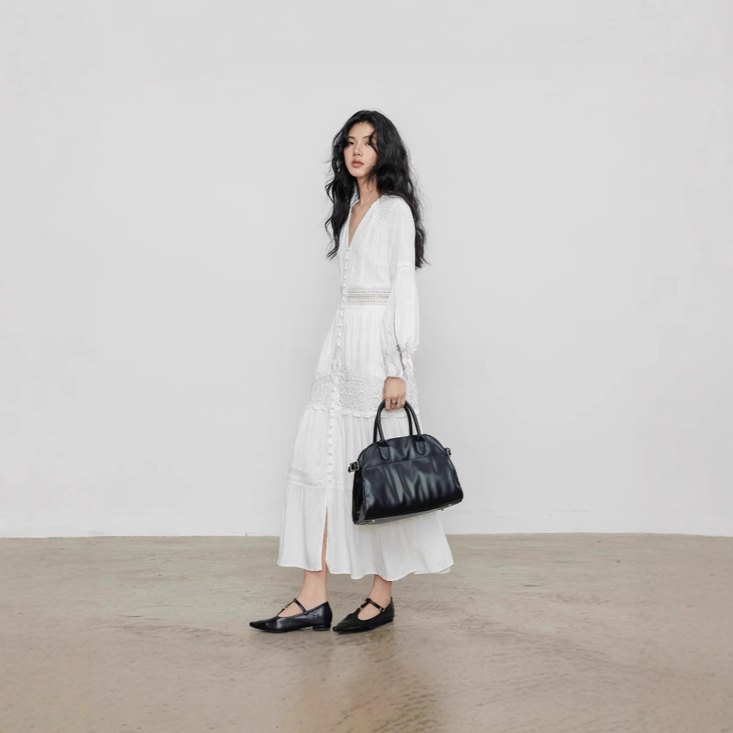 Gaun Kerah V Warna Putih Renda Industri Berat Gaya Perancis Rok Peri Besar Pinggang Ketat Musim Panas 2025 Wanita Minyak Selatan Asli