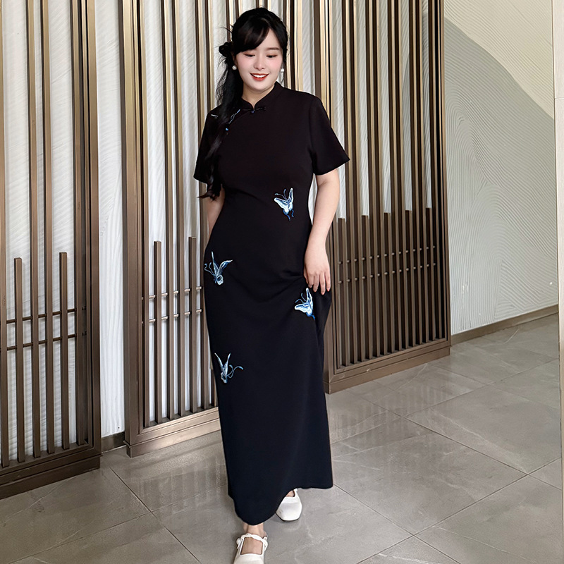 564201/56420 Gemuk MM2025 Musim Panas Baru Peningkatan Gaya Nasional Terlihat Langsing Retro Warna Hitam Bordir Gaya Tiongkok Baru Besar