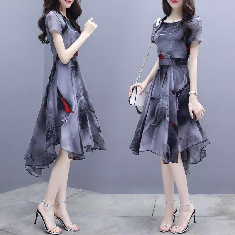 Gaun wanita lengan pendek, gaun wanita lengan pendek gaya Korea slim-fit ramping bermotif, rok Dovetail elegan modis musim panas 2022