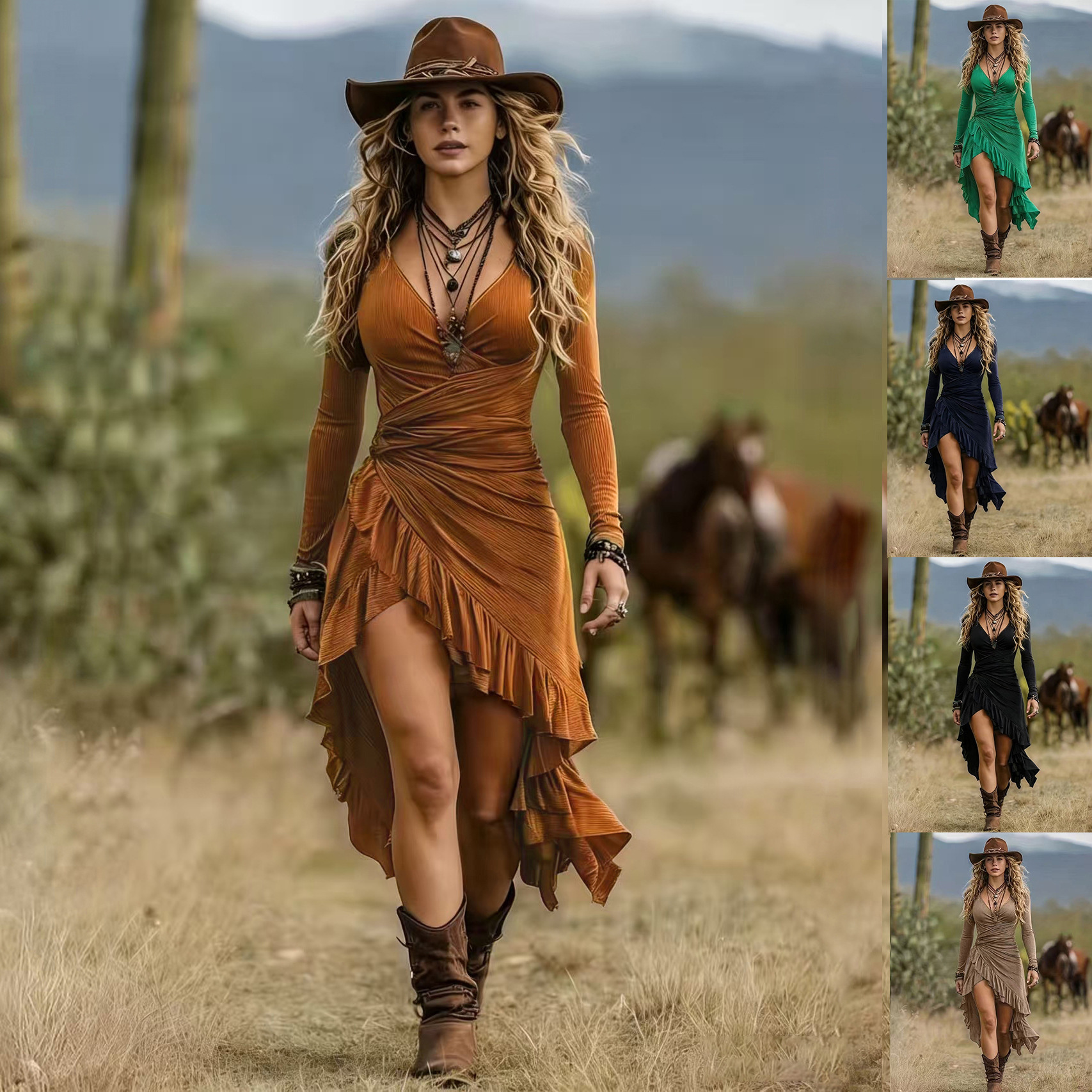 欧美跨境亚马逊女式中长波西米亚褶皱木耳荷叶边不规则连衣裙