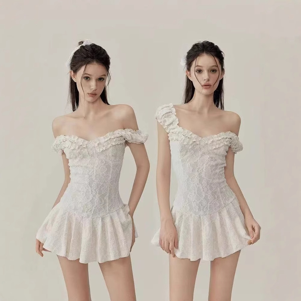 Gaun Super Pendek Pinggiran Jamur Renda Model Prancis Model Baru Komposit Murni Pakaian Berat Rok A-Line Musim Panas Kerah Satu Garis