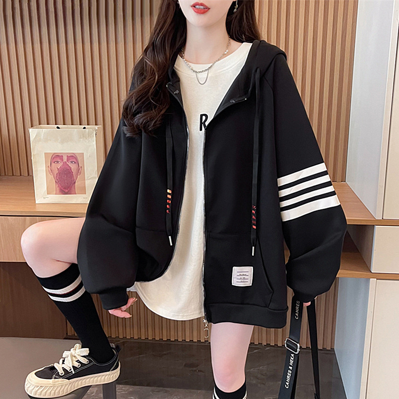 秋冬季薄款大码韩系慵懒风连帽卫衣外套女宽松休闲拉链开衫运动服
