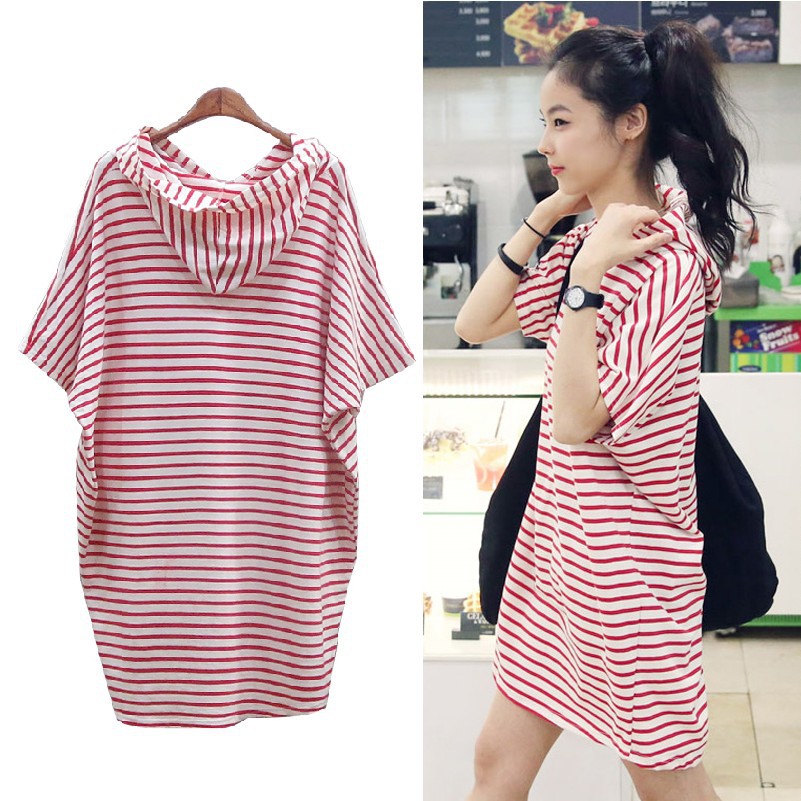 Penjualan langsung pabrik 2024 baru ukuran besar longgar bertudung panjang setengah lengan batwing gaun bergaris atasan musim panas wanita