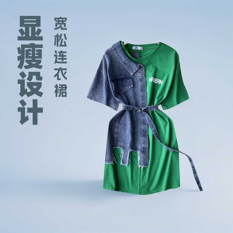 Gaun jahitan Denim kerah bulat wanita pendek pesan musim panas pelangsing pinggang panjang sedang tidak beraturan rok kaus Eropa dan Amerika
