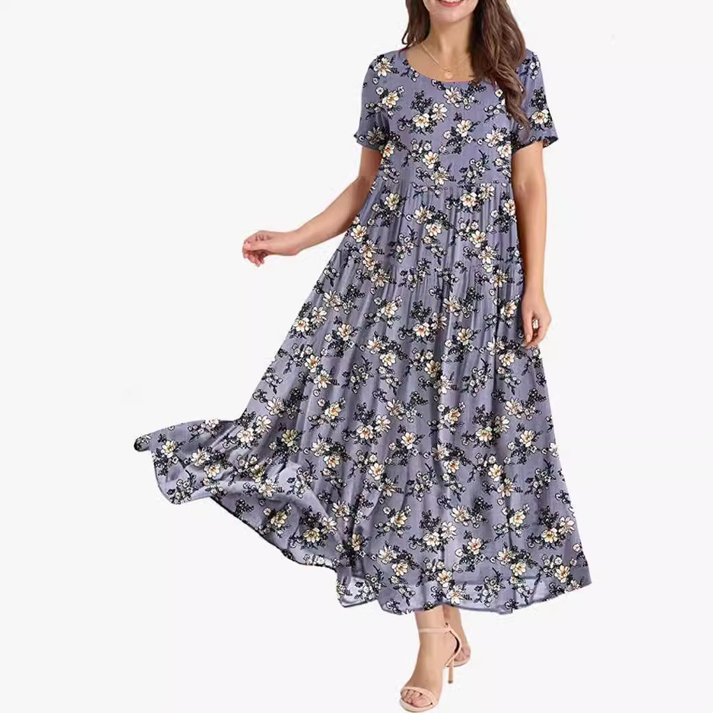 2023 Amazon TEMU Pakaian Wanita Musim Semi dan Musim Panas Ukuran Besar Gaya Eropa Amerika Gaun Besar Elegan Kerah Bulat Motif Cetak Lengan Pendek