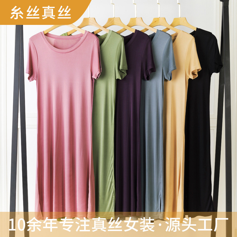 Gaun sutra, warna polos, ukuran besar, panjang sedang, gaun tidur panjang, gaun tidur sutra murbei, pakaian santai untuk wanita, modis dan elegan.