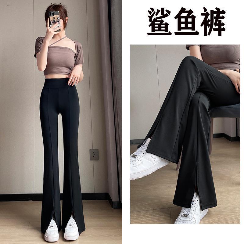 Celana hiu terpisah wanita tanduk mikro pelangsing pinggang tinggi 2024 celana panjang gemuk hitam baru ukuran plus celana sepatu kuda