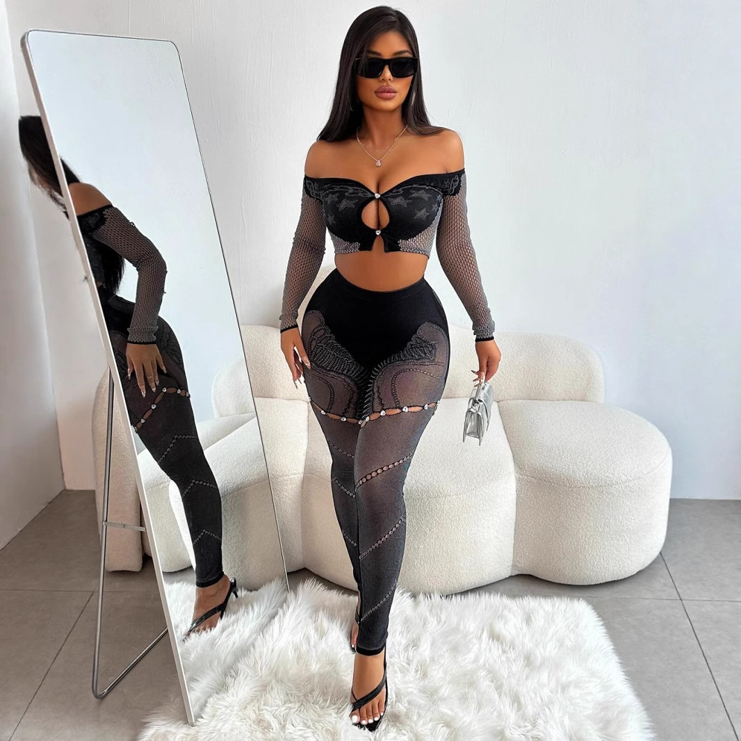 Han Yi Setelan Kasual Rajutan Eropa dan Amerika Baju Atasan Pas Badan Lengan Panjang Tali Pusar Lengan Panjang Bahu Rajutan Warna Solid