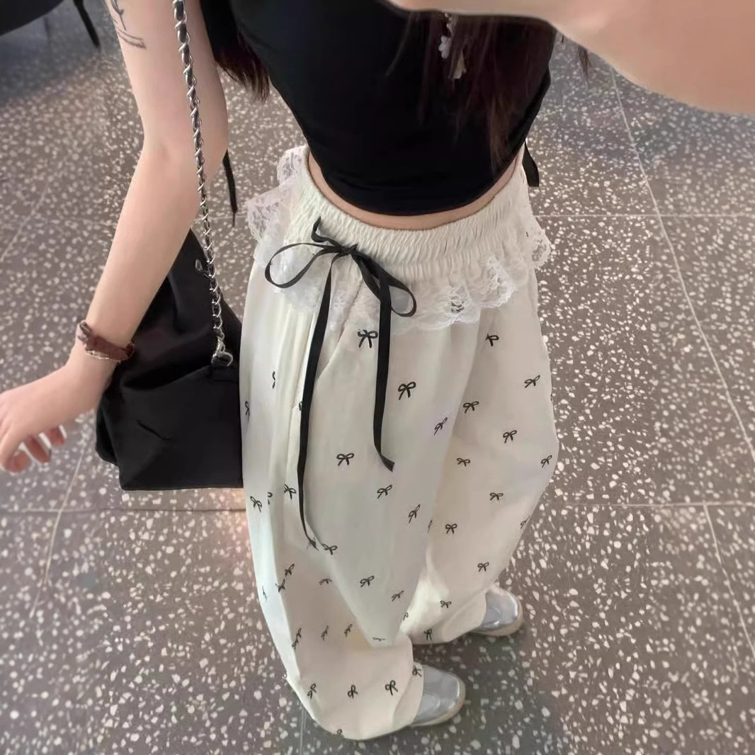 Gadis Manis Celana Kasual Jahitan Renda Celana Pita Kupu-Kupu Celana Wanita Musim Panas Longgar Elastis Pinggang Lebar Kaki Celana Lurus