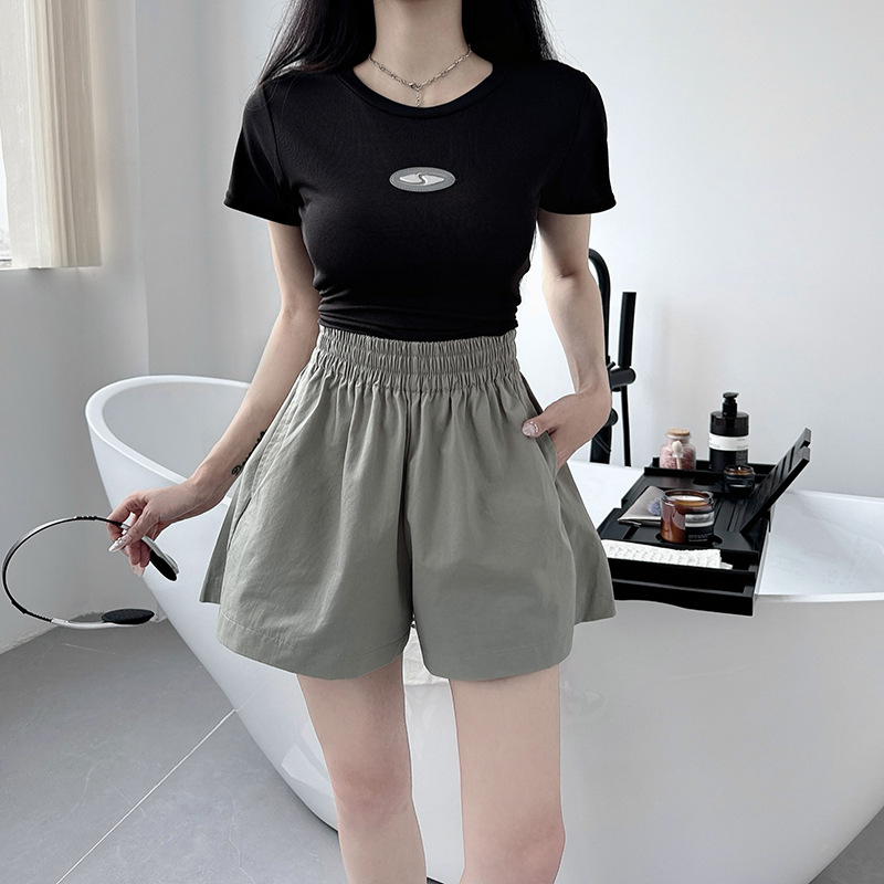 Celana pendek kasual dicuci gaya Korea wanita, celana pendek longgar kaki lebar kasual pinggang tinggi musim panas